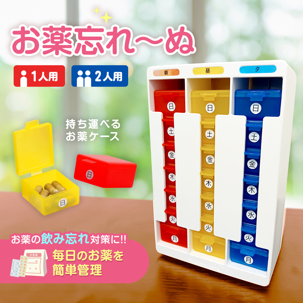 商品説明 | • 「今日、飲んだっけ?」をゼロにする安心感 • 一目で分かるカラーデザインで、誰でも簡単に使える • 見える化された服薬で、ご家族も安心 • 毎日のルーティンが自然と身につく構造設計 • 介護や子育ての場面でも、負担を軽減するサポートツール |